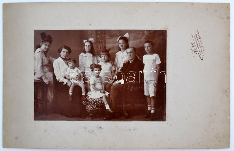 cca 1918 Szászrégen, Scheffel Béla, a Szászrégen és vidéke Takarék és Hitel Rt. főkönyvelője feleségével Lator Margittal és hét gyermekükkel, 13x19 cm, karton 21x32 cm