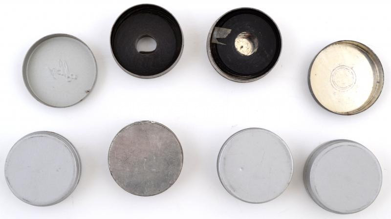 cca 1940 Ismeretlen témájú és minőségű amatőr mozgófilmek (nem ellenőrzött tétel) 6 db 5,5 mm átmérőjű kis fémdobozban kb. 2-3 perces, 2x8 mm-es felvételek Fekete György (1904-1990) budapesti fényképész hagyatékából