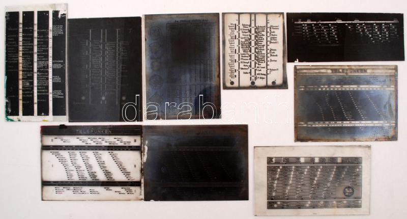 cca 1940 Rádió állomások beállításához készült üveglemez táblák (7 db), + 1 db üveglemezen az 1941-es rádiók árlistája, öt különböző gyártó emblémájával, Fekete György (1904-1990) fényképész hagyatékából, 13x11 cm és 18x13 cm közötti méretekben