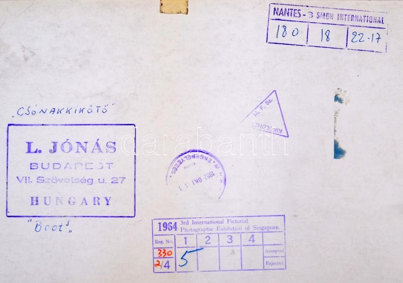 cca 1962 Jónás L.: Csónakkikötő, pecséttel jelzett, feliratozott vinta... https://www.darabanth.com/de/250-Fernauktion/250.0/Andere-Sammelgebiete/Foto~1400037/cca-1962-Jonas-L-Csonakkikoto-pecsettel-jelzett-feliratozott-vintage-fotomuveszeti-alko~II1200635