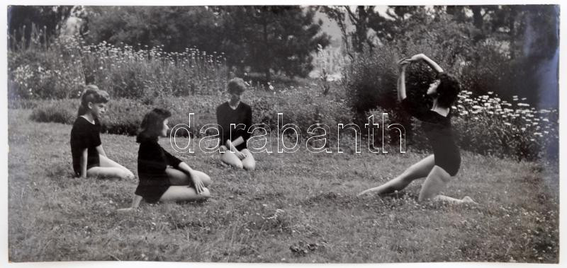 cca 1964 Dezső Pál (Kecskemét): Modern gimnasztika, feliratozott vintage fotóművészeti alkotás a szerző hagyatékából, kiállítási emlékjeggyel, 18x39 cm