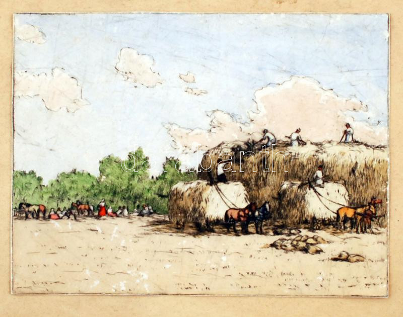 Beschreibung: Csillag József (1894-1977): Betakarítás, színezett rézkarc, papír, jelzés nélkül, kartonra ragasztva, 18x23cm