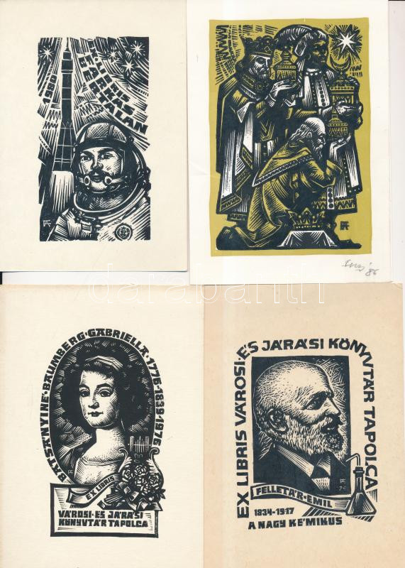 Beschreibung: Fery Antal (1908-1944): 4 db ex libris, klisé, papír, jelzett, ebből 3 dúcon, cca 15x11cm és 14x9cm