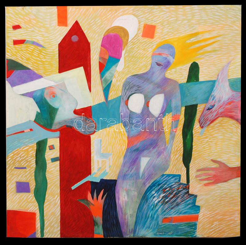Beschreibung: Hincz jelzéssel: Alakok, tárgyak. Olaj, farost (apró hibákkal), (hátoldalán Hincz jelzéssel), 72×72 cm