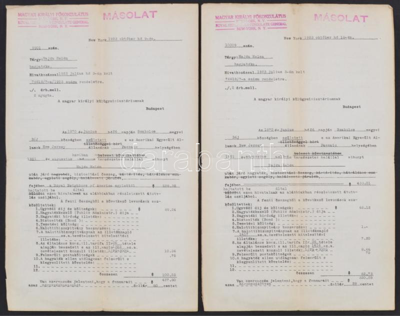1923 Magyar Királyi Főkonzulátusának New-York levele hagyaték ügyben, 2db, 36x21cm