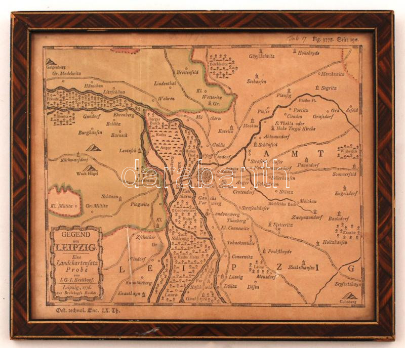 Beschreibung: 1776 Gegend um Leipzig, eine Landchartenschatz-Probe. Az Oekonomisch-technologische Encyklopadie (Leipzig, 1776) 60. kötetének térképmelléklete (Fig. 3778, Seite 190), üvegezett fa keretben, 21×25 cm