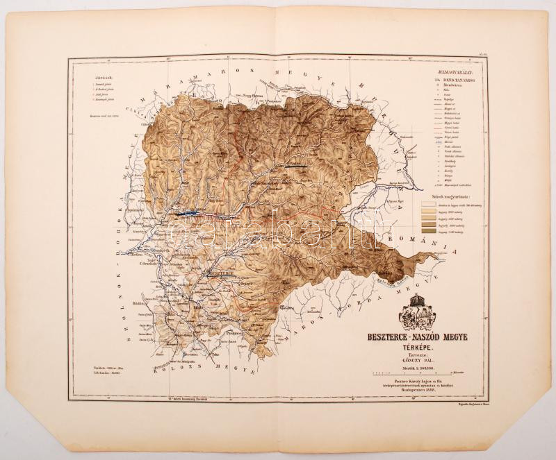 Beszterce- Naszód megye térképe, Gönczy Pál - Kogutowicz Manó: Magyarország megyéinek kézi atlasza. Tervezte: - -, rajzolta: - - Bp. (1890.) Posner Károly Lajos és fia. 2 sarok levágva, egyébként jó állapotban, 45x57cm