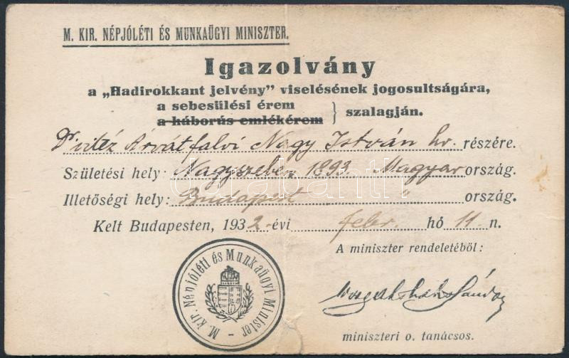Beschreibung: 1932 Igazolvány a "Hadirokkant jelvény" viselésének jogosultságára a sebesülési érem szalagján, apró szakadással, 7x11cm