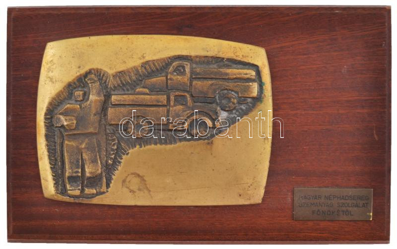 Beschreibung: Jelzés nélkül: Bronz plakett Magyar Néphadsereg üzemanyag szolgálat főnökétől felirattal, fa szupporton, 17x12cm