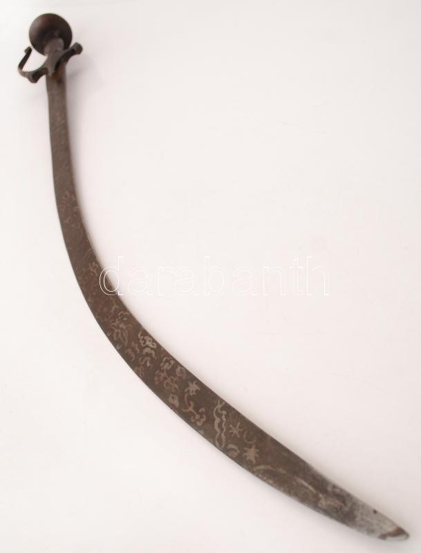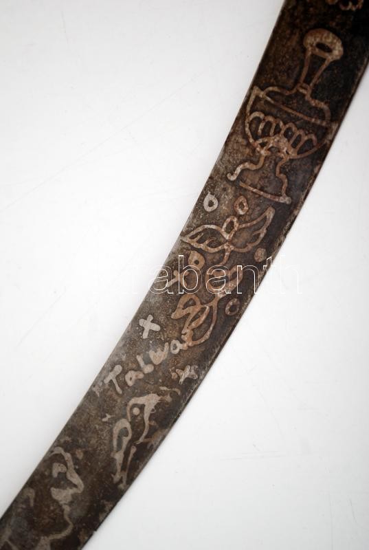 Régi indiai talwar, rozsdás, pengéjén talán későbbi naiv díszítéssel, pengehossz: 75,5 cm, teljes hossz: 87,5 cm / Antique talwar Indian sword, rusty, ornated with naive motifs on the blade (probably added later), blade length: 75,5 cm, full length: 87,5 cm