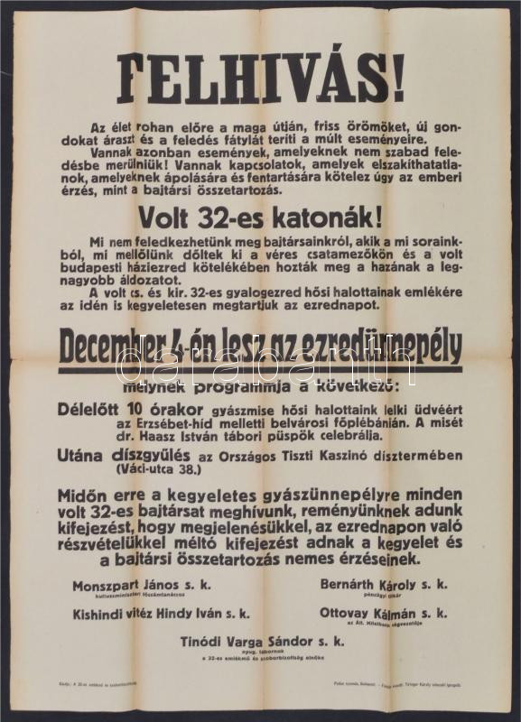 Beschreibung: cca 1920-30 Felhívás a Budapest volt házi ezredének a cs. és kir. 32. gyalogezred hősi halottainak emlékére, jó állapotú plakát, 63x47cm
