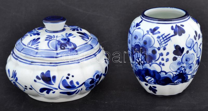 Beschreibung: Delftsblau kék-fehér mini váza és bonbonier tetővel, kézzel festett, hibátlan, jelzett, m: 7 és 8 cm, d: 6,5 és 10 cm