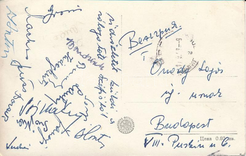 Beschreibung: 1957 A magyar futball-válogatott tagjainak aláírása Szófiából küldött levelezőlapon (Bozsik, Hidegkuti, Szojka, stb.)