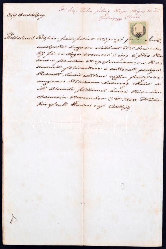 Beschreibung: 1853 Hőbe József dudari lelkész adóslevele 6kr nyomathiányos CM okmánybélyeg