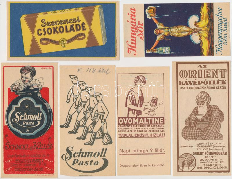 Beschreibung: 6 db színes számolócédula(Szerencsi Csokoládé, Schmoll Pasta, Hungária sör, Orient kávépótlék, Ovomaltine, Schmoll pasta)