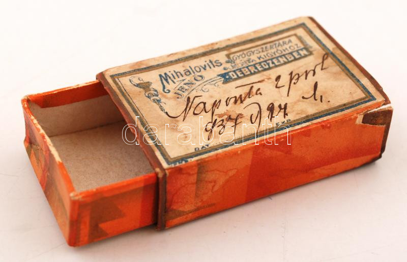 Beschreibung: Mihalovits Jenő Gyógyszertára Debrecenben papír gyógyszeres dobozka, 6x4x2 cm