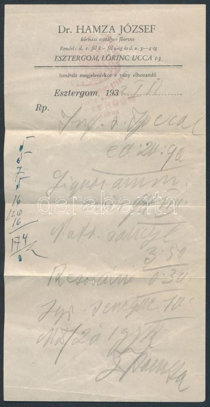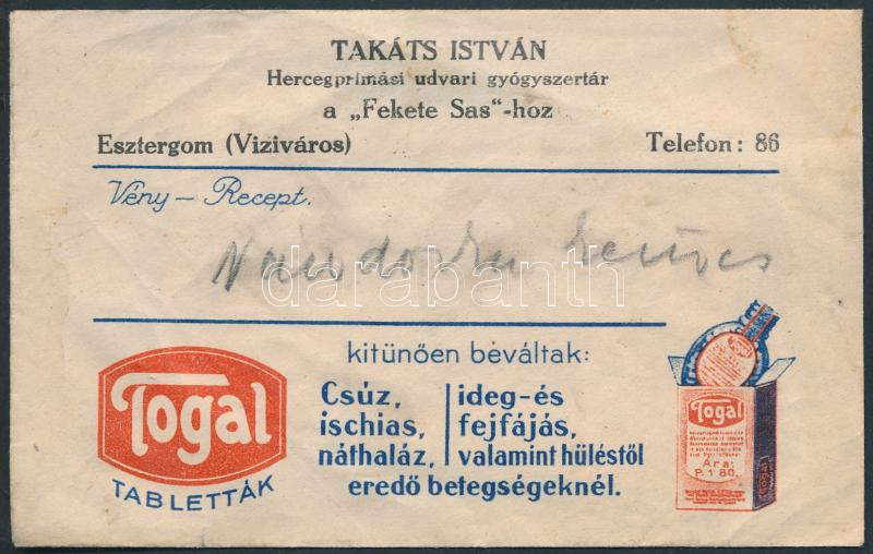 cca 1930 Takáts István Hercegprímás udvari gyógyszertár a "Fekete Sas"-hoz, Esztergom (Viziváros), 8x13cm+ recept Dr. Hamza József, (Esztergom, Lőrinc ucca 13.), 17x8cm