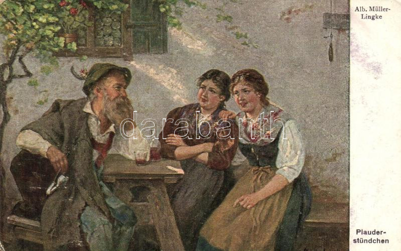 'Plauderstündchen', Münchener Künstlerkarte No. 24, s: Müller-Lingke https://www.darabanth.com/de/250-Fernauktion/250.0/Ansichtskarten/Bier-Alkohol-Tabak~200111/Plauderstundchen-Munchener-Kunstlerkarte-No-24-s-Muller-Lingke~II1205414