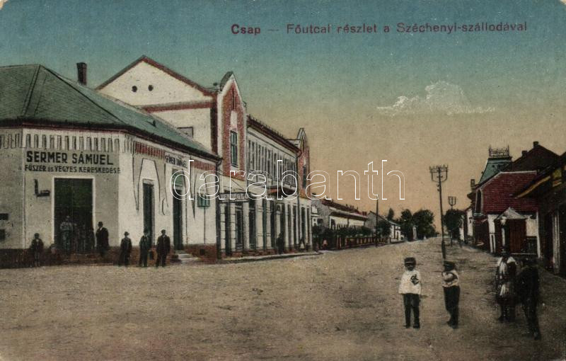 Beschreibung: Csap, Csop; Széchenyi szálloda, Semer Sámuel fűszer és vegyeskereskedése / hotel, shop