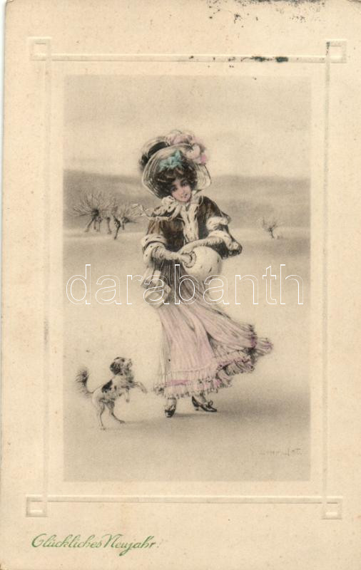 New Year, Lady with dog, P.T.L. Art de Vienne No. 121., artist signed ... https://www.darabanth.com/de/250-Fernauktion/250.0/Ansichtskarten/Kunstler~200104/New-Year-Lady-with-dog-PTL-Art-de-Vienne-No-121-artist-signed-EK~II1200444