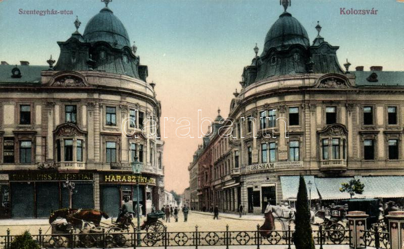 Kolozsvár, Cluj; Szentegyház utca, Frank Kiss János fiai, Haraszthy Jenő üzletei, Triszeti Általános Biztosító Társulat, The Gresham életbiztosító társaság Erdélyrészi ügynöksége, lovaskocsi / street, shops, insurance companies, carriage
