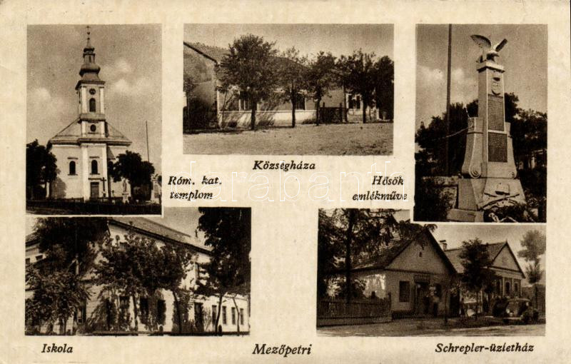 Mezőpetri, Petresti; Római Katolikus templom, községháza, Hősök emlékműve, iskola, Schrepler-üzletház / church, town-hall, monument, school, shop (fa)