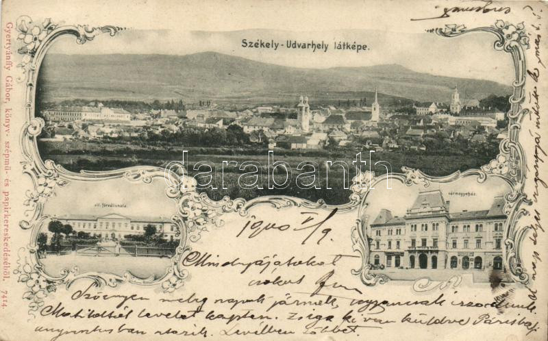 Beschreibung: Székelyudvarhely, Állami főreáliskola, Vármegyeháza, kiadja Gyertyánffy Gábor / school, county hall, floral, Art Nouveau (kis szakadás / small tear)
