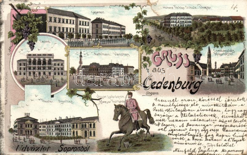 Beschreibung: 1899 Sopron, Kaszinó, Kaszárnya, Városház, Megyeház, Színház, Nők főiskolája; litho (r)