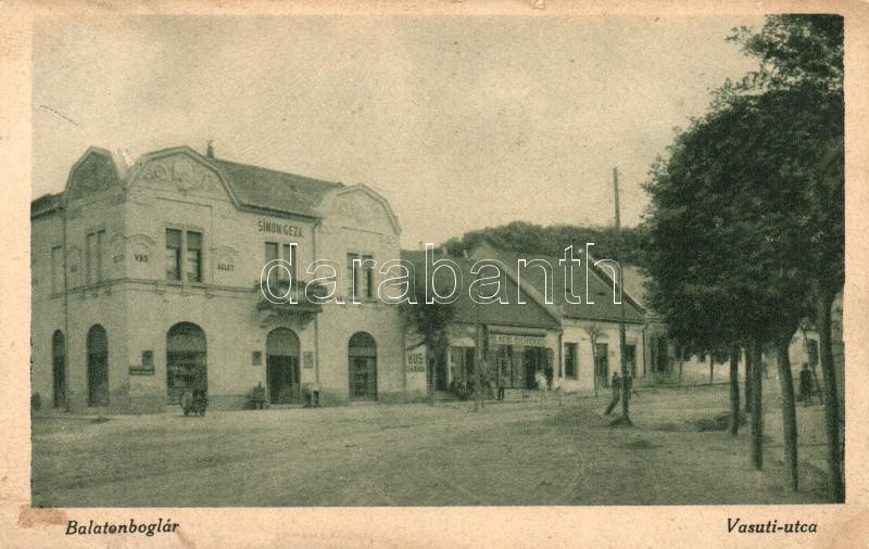 Balatonboglár, Vasúti utca, Simon Géza vasüzlete (kis szakadás / small... https://www.darabanth.com/de/250-Fernauktion/250.0/Ansichtskarten/Ungarn~200006/Balatonboglar-Vasuti-utca-Simon-Geza-vasuzlete-kis-szakadas-small-tear~II1205737