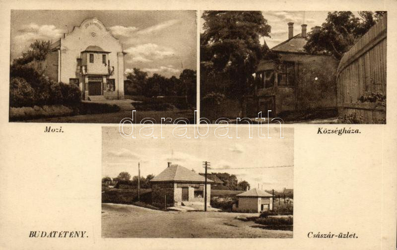 Beschreibung: Budapes XXII. Budatétény, Mozi, Községháza, Császár-üzlet, kiadja Császár István (ázott / wet damage)
