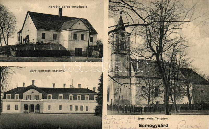 Beschreibung: Somogysárd, Horváth Lajos vendéglője, Báró Somsich kastélya, Római katolikus templom