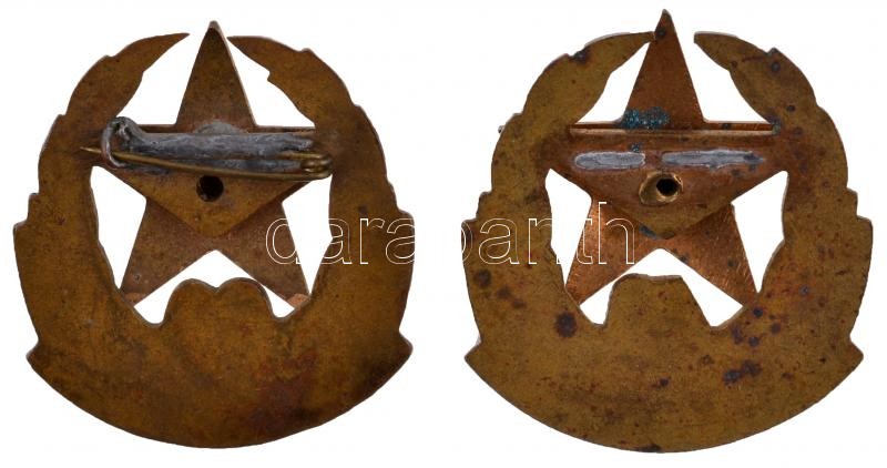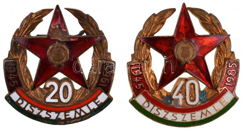 Beschreibung: 1965. "Díszszemle 20 - 1945-1965" zománcozott fém jelvény javított tűvel, zománchibás + 1985. "Díszszemle 40 - 1945-1985" zománcozott fém jelvény hiányzó tűvel T:2,2-