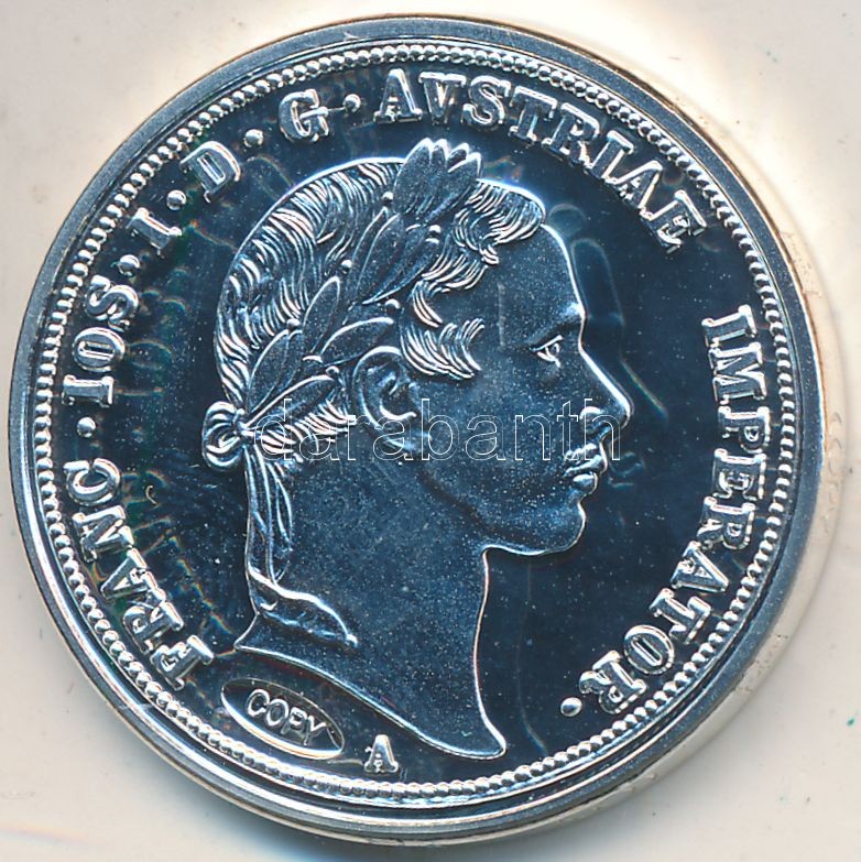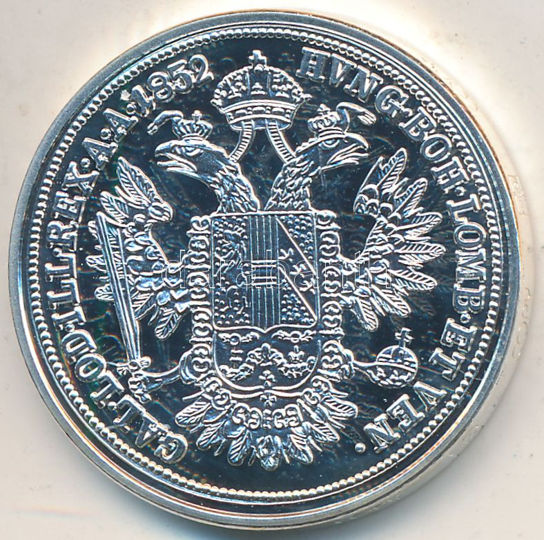Beschreibung: DN "Osztrák-Magyar Monarchia pénzei utánveretben - 1852 ezüst féltallér" ezüstözött Cu-Ni emlékérem tanúsítvánnyal, "COPY" beütéssel (32mm) T:PP