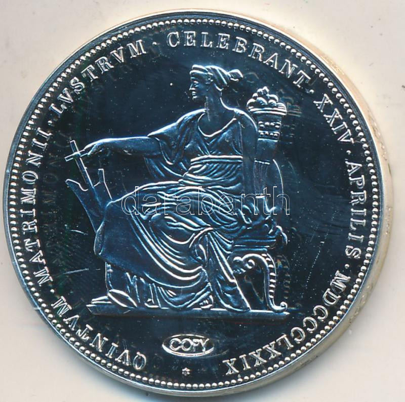 Beschreibung: DN "Osztrák-Magyar Monarchia pénzei utánveretben - 1879. két gulden" ezüstözött Cu-Ni emlékérem tanúsítvánnyal, "COPY" beütéssel (38mm) T:PP
