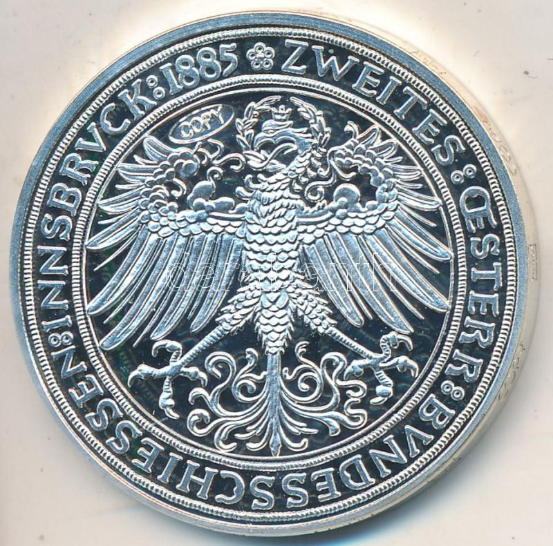 Beschreibung: DN "Osztrák-Magyar Monarchia pénzei utánveretben - 1885 két gulden" ezüstözött Cu-Ni emlékérem tanúsítvánnyal, "COPY" beütéssel (38mm) T:PP