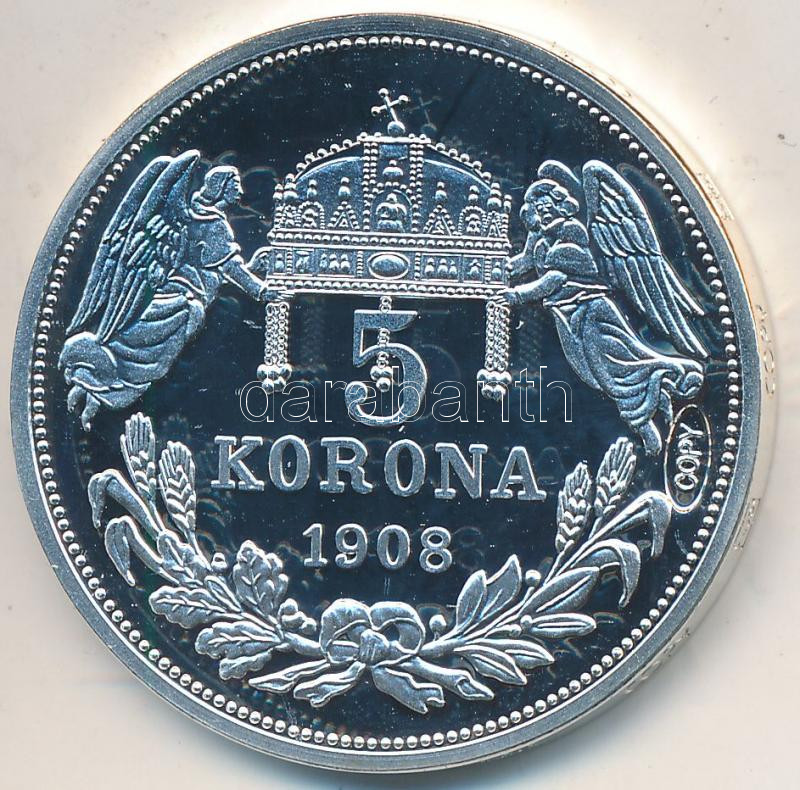 Beschreibung: DN "Osztrák-Magyar Monarchia pénzei utánveretben - 1908. 5 korona" ezüstözött Cu-Ni emlékérem "COPY" beütéssel, tanúsítvánnyal (38mm) T:PP