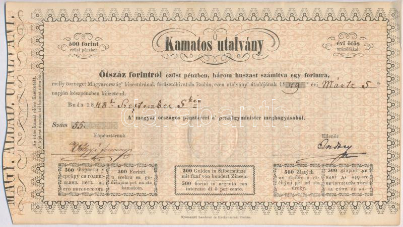 1848. 500Ft "Kamatos Utalvány" rózsaszín változat, kamatszelvény nincs... https://www.darabanth.com/de/250-Fernauktion/250.0/Numismatik/Ungarische-Banknoten~7/1848-500Ft-Kamatos-Utalvany-rozsaszin-valtozat-kamatszelveny-nincs-Endrey-Endre-sajat-kez~II1205524