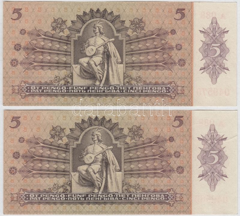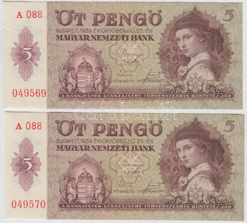 1939. 5P (2x) sorszámkövetők az egyik nyomdai papírránccal T:I https://www.darabanth.com/de/250-Fernauktion/250.0/Numismatik/Ungarische-Banknoten~7/1939-5P-2x-sorszamkovetok-az-egyik-nyomdai-papirranccal-TI~II1200713