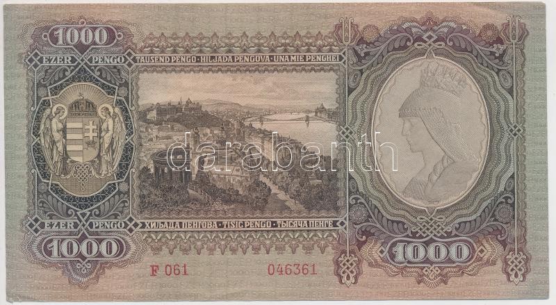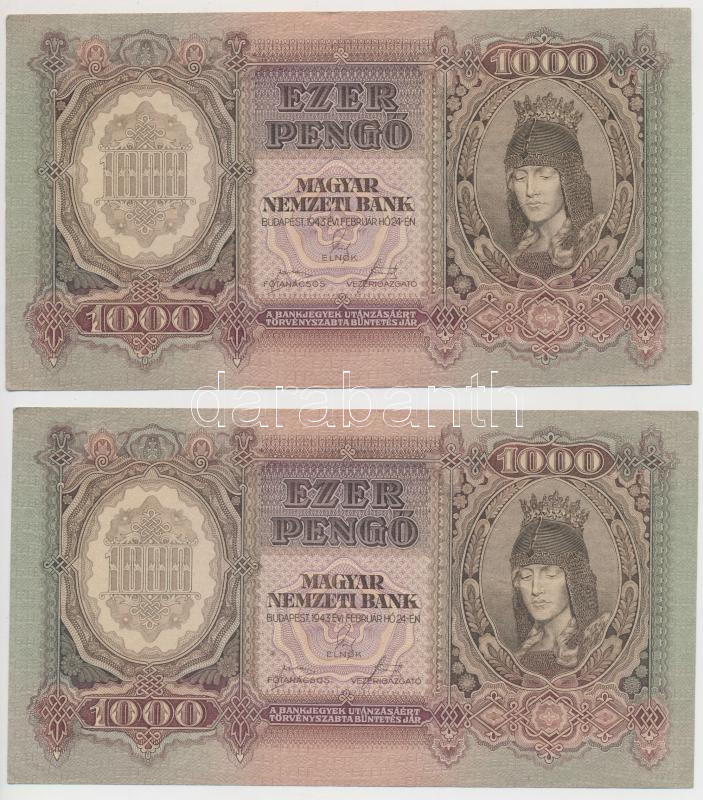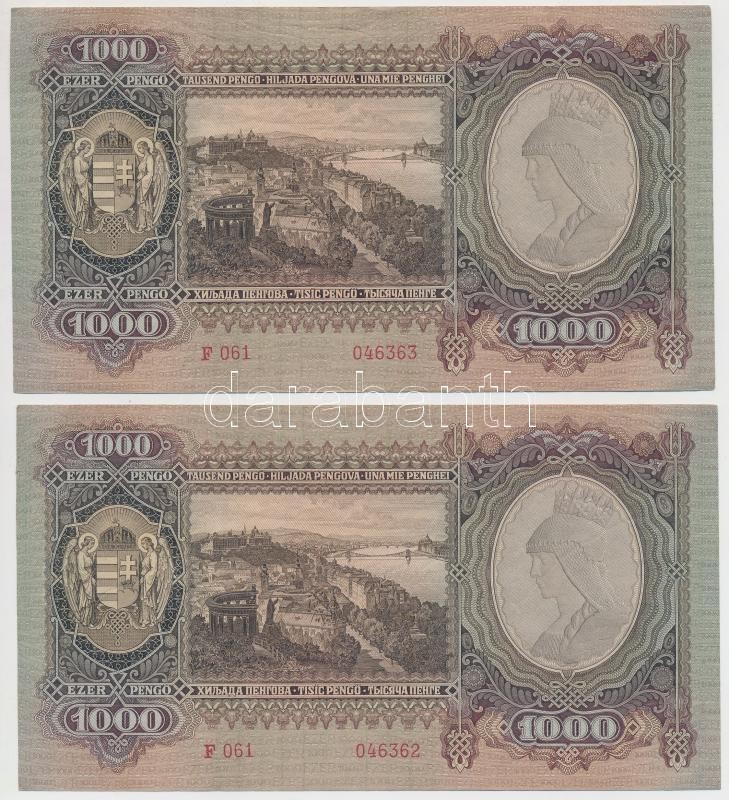 1943. 1000P (3x) sorszámkövetők, nyomdai papírránccal T:I- https://www.darabanth.com/de/250-Fernauktion/250.0/Numismatik/Ungarische-Banknoten~7/1943-1000P-3x-sorszamkovetok-nyomdai-papirranccal-TI-~II1205776