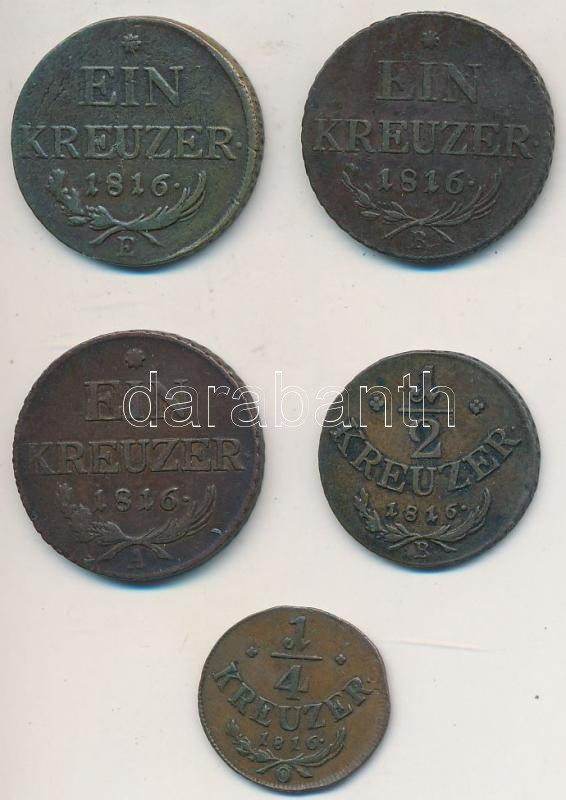 1816O 1/4kr Cu + 1816B 1/2kr Cu + 1816A+B+E 1kr Cu (3xklf) T:2-,3 https://www.darabanth.com/de/250-Fernauktion/250.0/Numismatik/Ungarische-Munzen~9/1816O-14kr-Cu-plus-1816B-12kr-Cu-plus-1816AplusBplusE-1kr-Cu-3xklf-T2-3~II1201907