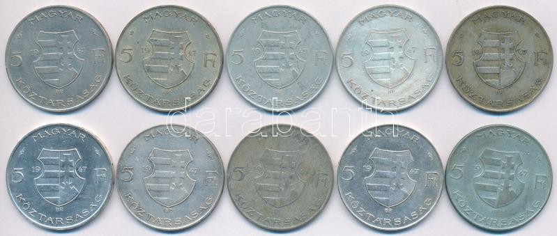 1947. 5Ft Ag "Kossuth" (10x) T:2-,3 https://www.darabanth.com/de/250-Fernauktion/250.0/Numismatik/Ungarische-Munzen~9/1947-5Ft-Ag-Kossuth-10x-T2-3~II1206404