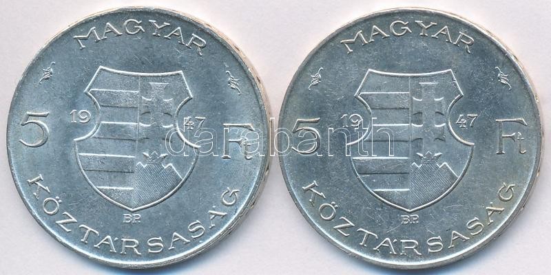 1947. 5Ft Ag "Kossuth" (2x) T:2,2- https://www.darabanth.com/de/250-Fernauktion/250.0/Numismatik/Ungarische-Munzen~9/1947-5Ft-Ag-Kossuth-2x-T2-2-~II1206402