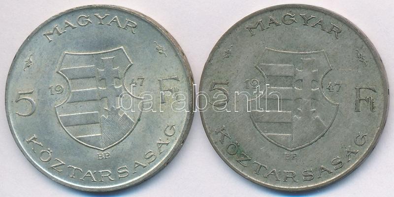 1947. 5Ft Ag "Kossuth" (2x) T:2-,3 https://www.darabanth.com/de/250-Fernauktion/250.0/Numismatik/Ungarische-Munzen~9/1947-5Ft-Ag-Kossuth-2x-T2-3~II1206389