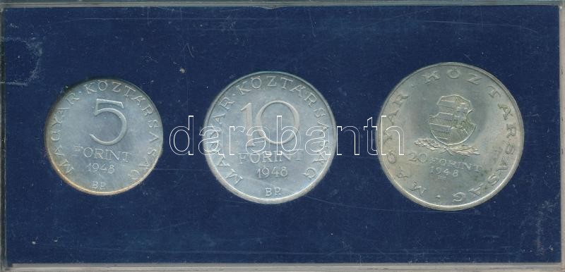 Beschreibung: 1948. 5Ft Ag "Petőfi" + 10Ft Ag "Széchenyi" + 20Ft Ag "Táncsics" "Szabadságharc" sor, eredeti MNB plasztiktokban T:2