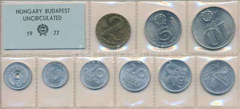 1977. 2f-10Ft 9db klf, érmés forgalmi sor fóliatokban T:1 https://www.darabanth.com/de/250-Fernauktion/250.0/Numismatik/Ungarische-Munzen~9/1977-2f-10Ft-9db-klf-ermes-forgalmi-sor-foliatokban-T1~II1206429