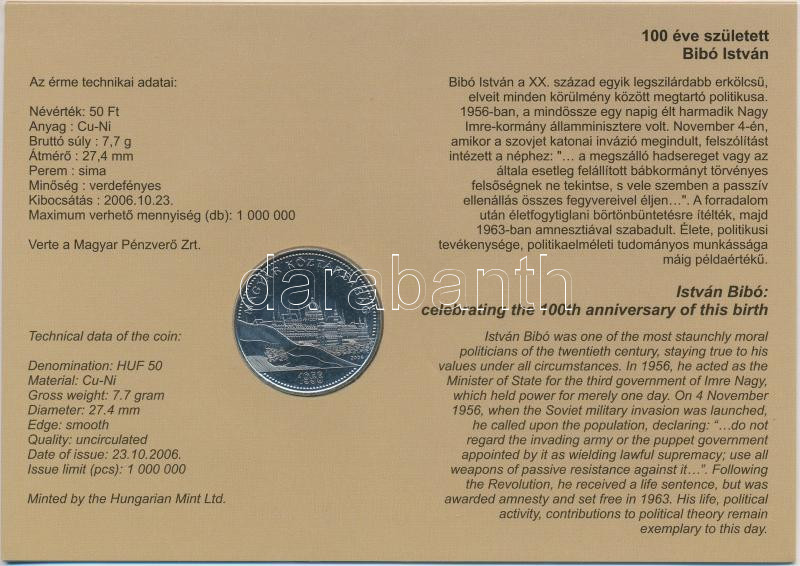2006. 50Ft "100 éve született Bibó István" emlékkiadás emléklapon T:1 https://www.darabanth.com/de/250-Fernauktion/250.0/Numismatik/Ungarische-Munzen~9/2006-50Ft-100-eve-szuletett-Bibo-Istvan-emlekkiadas-emleklapon-T1~II1207485