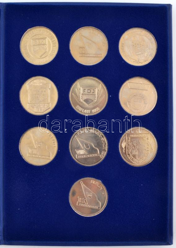 NDK ~1940-1970. "Szabad Német Ifjúság" 10xklf fém emlékérem eredeti, kék éremtartóba rögzítve (34mm) T:1,1-,2
