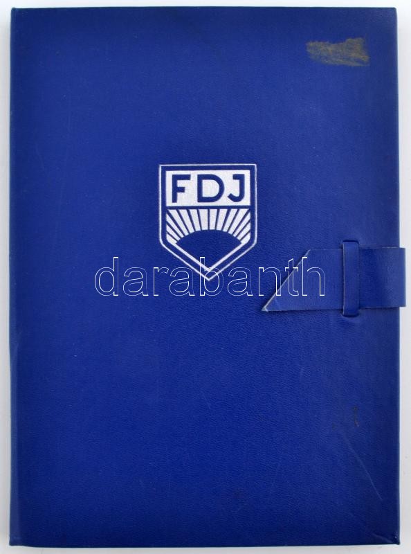 GDR ~1940-1970. "Freie Deutsche Jugend" 10xdiff metal medallion bound to original blue case (34mm) C:UNC,AU,XF