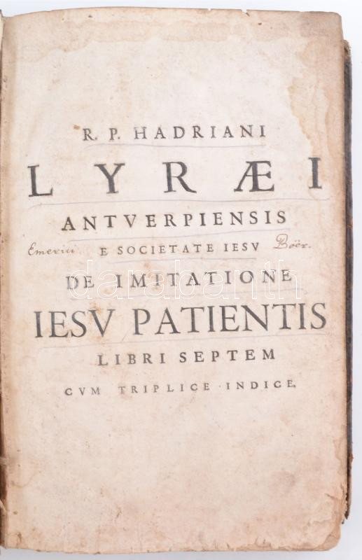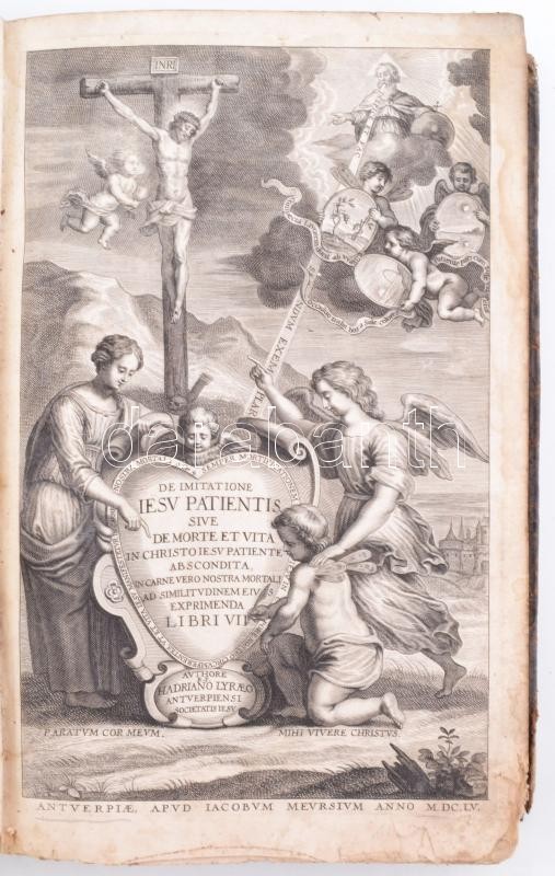 Lyraeus, Hadrianus [Van Lyere, Adriaan]: De imitatione Iesu patientis sive de morte et vita in Christo Iesu patiente abscondita, in carne vero nostra mortali ad similitudinem eius experimenda, libri VII. Antwerpen, 1655, Jacob van Meurs. Az elején egészoldalas metszettel? valamint szövegközi ábrákkal. Sérült lapszélekkel, megviselt állapotú bőrkötésben.