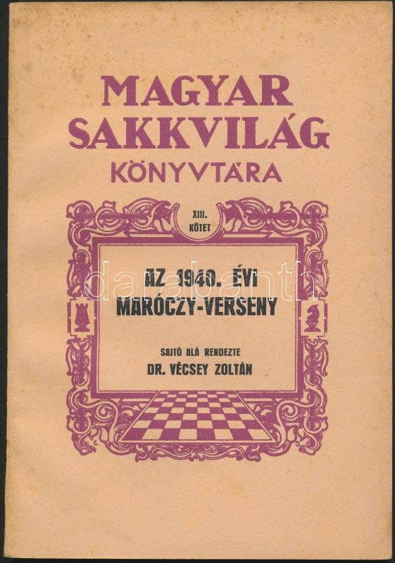 Az 1940. évi Maróczy-verseny. Magyar Sakkvilág Könyvtára XIII. kötet. Sajtó alá rendezte Dr. Vécsey Zoltán. Kecskemét, Magyar Sakkvilág. Kiadói papírkötés, jó állapotban.